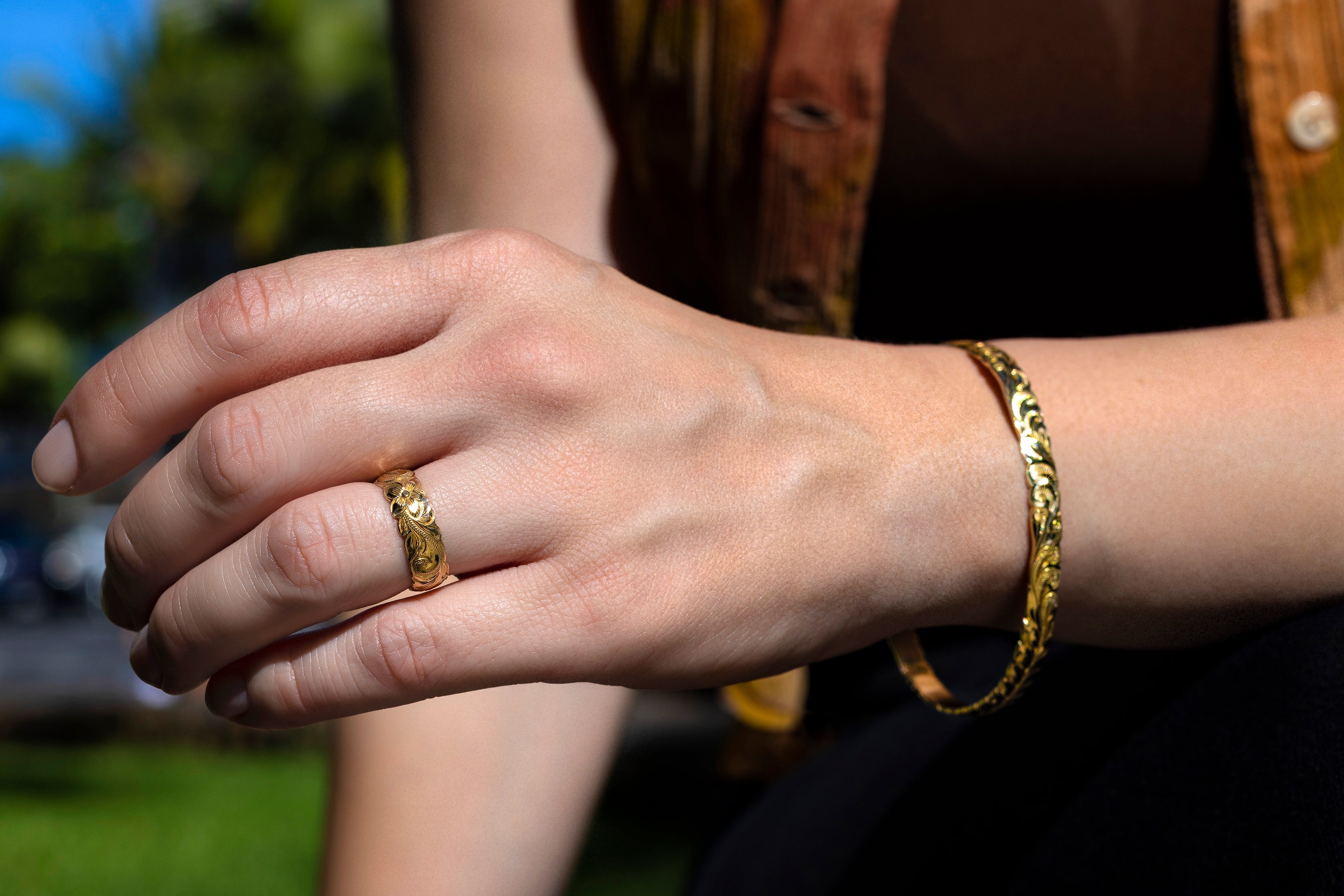 Women’s engraved ring designed for everyday wear. The ring features a continuous band with raised floral and organic-style detailing around the outer surface. The polished finish highlights the carved pattern, giving the piece a classic and decorative appearance suitable for daily styling or special occasions.