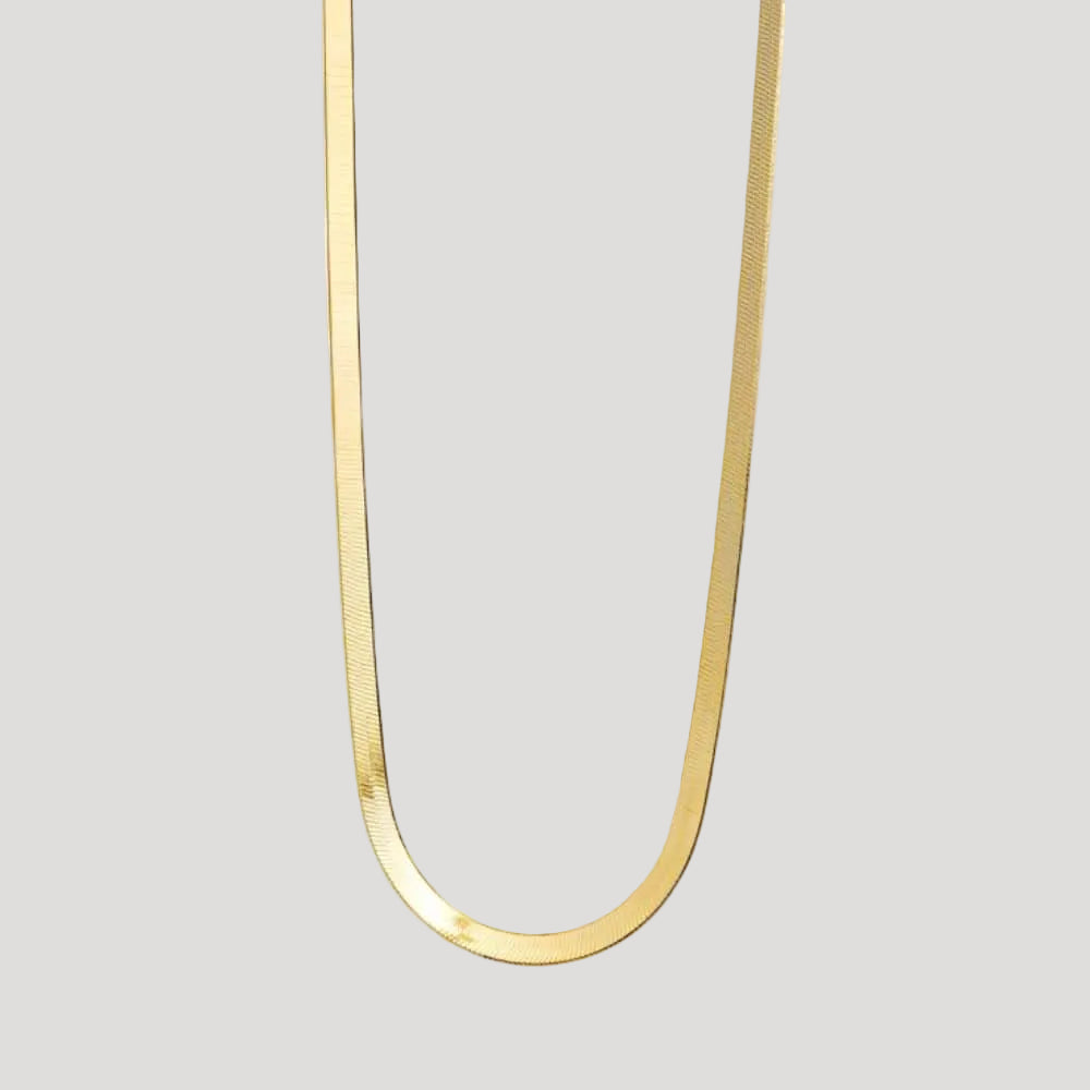 This necklace is designed as a flat herringbone chain necklace with a continuous linked pattern. The chain consists of closely connected segments that form a smooth, flat surface. A standard clasp closure connects the ends of the chain to complete the necklace structure.