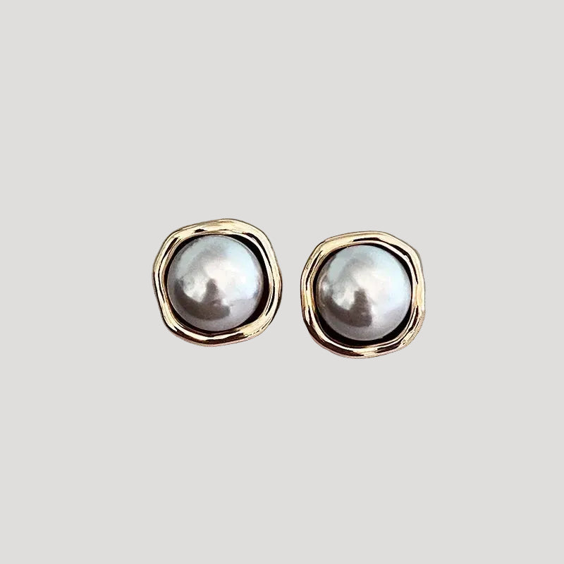 The earrings are constructed with a fixed stud design and a flat backing. The combination of a round pearl and a smooth metal frame results in a simple structure without moving components.