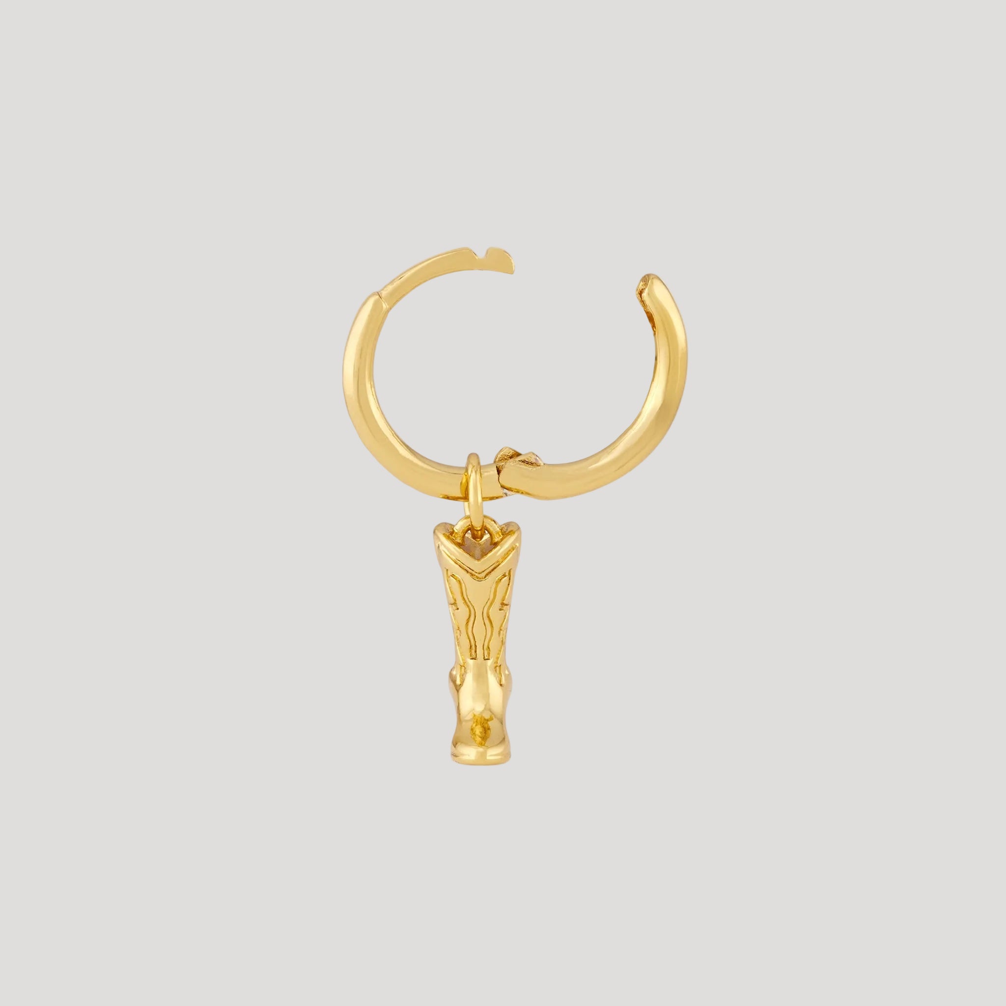 These huggie hoop earrings are designed as small hoop earrings with a hanging boot-shaped charm. The compact hoop structure forms a rounded profile, while the charm is attached as a single dangling element below the hoop. A hinged closure mechanism allows the earrings to open and close securely while maintaining a consistent hoop shape.
