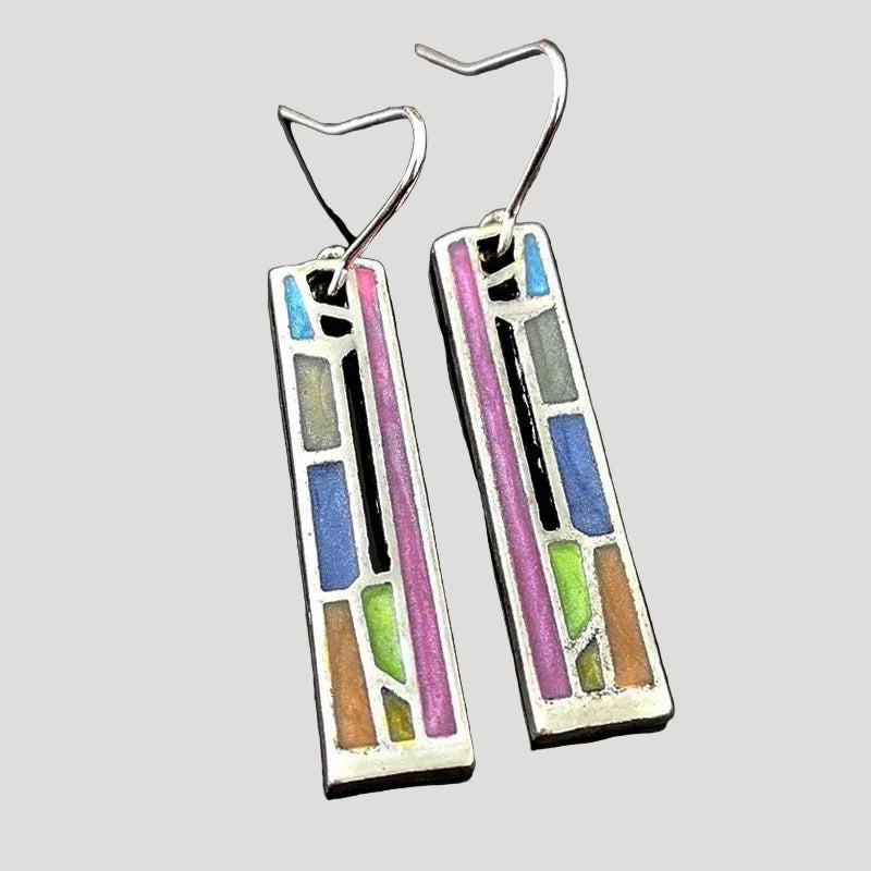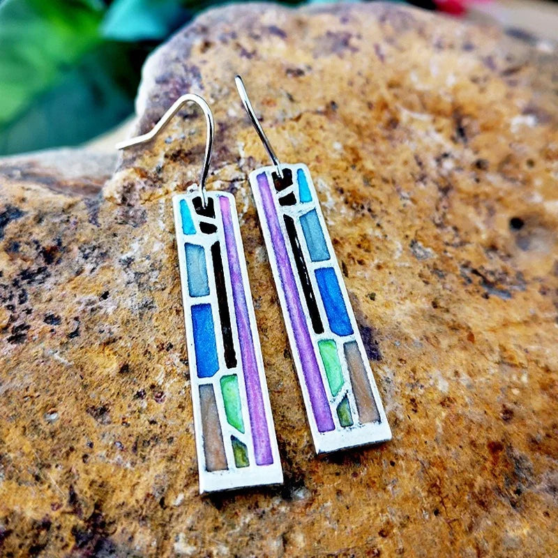 Women’s drop earrings designed with a slim rectangular shape and decorative panel layout. The earrings feature a suspended design with hook fastening and a structured surface pattern inspired by vintage jewellery styles. The elongated form creates gentle movement when worn and adds visual interest without excess detail.
