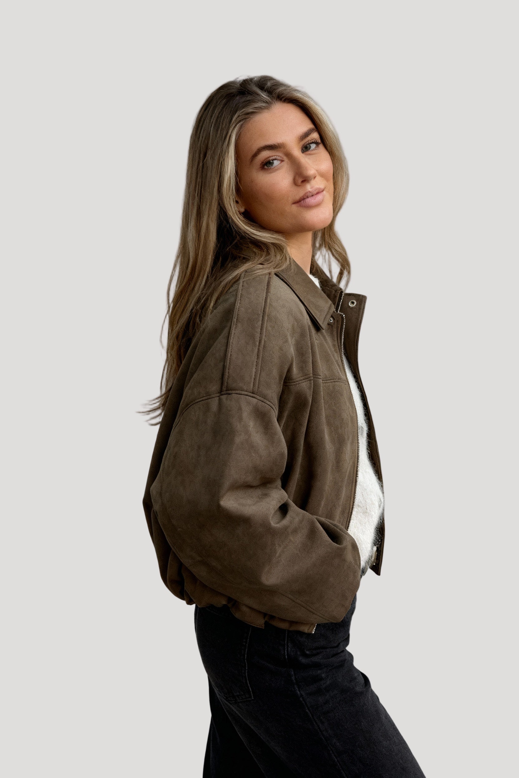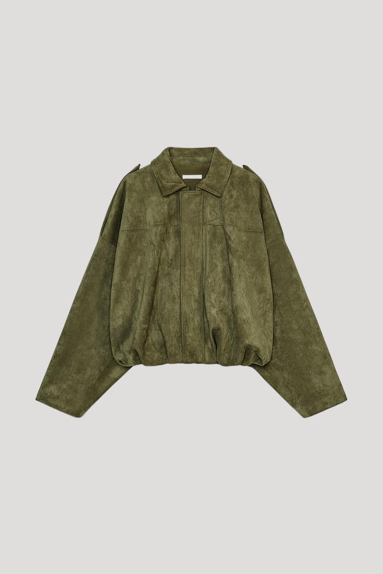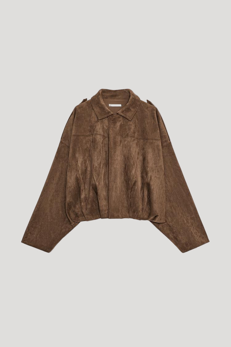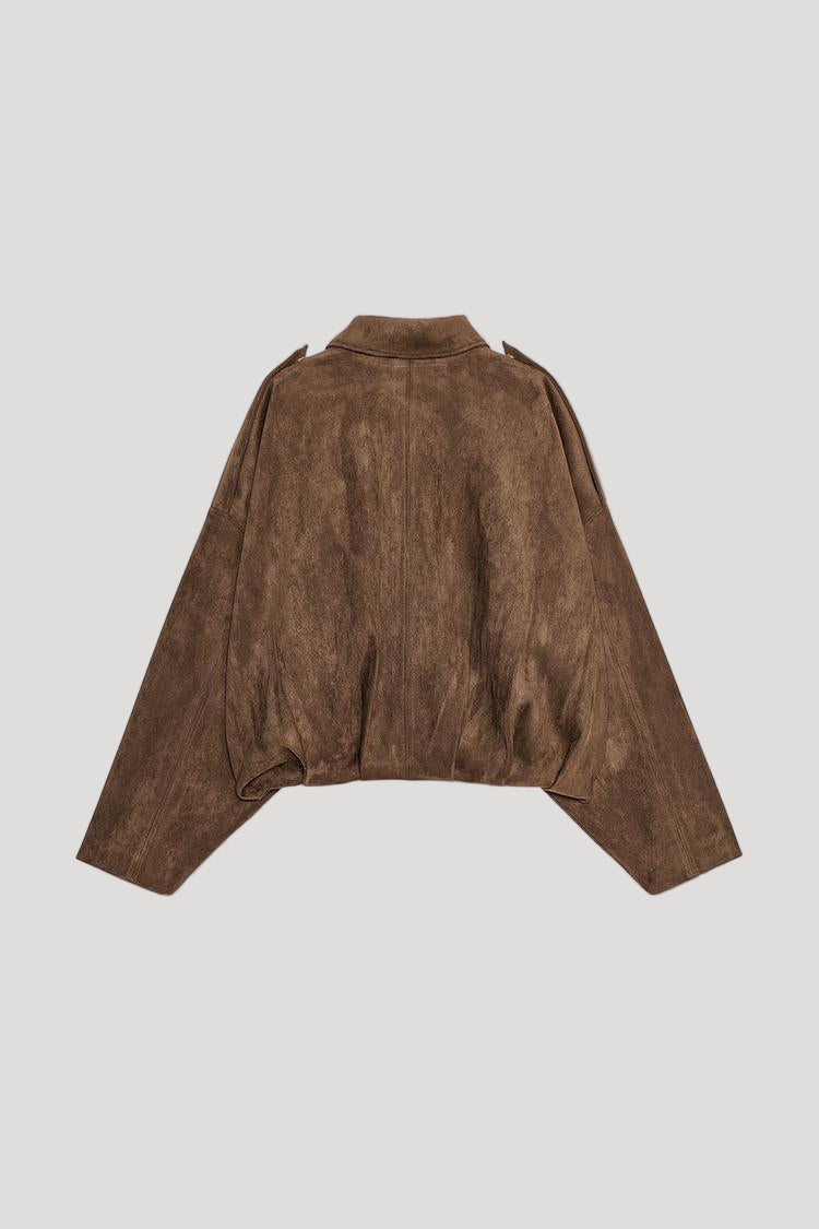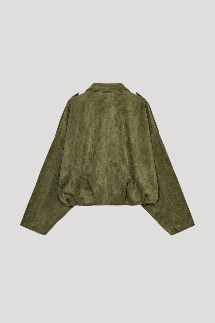 This bomber jacket features a refined notched lapel and relaxed batwing sleeves. The smooth, velvety surface and structured silhouette create a modern, elegant look. The pleated hem and concealed front placket add a clean, contemporary finish suitable for both casual and dressed-up outfits.