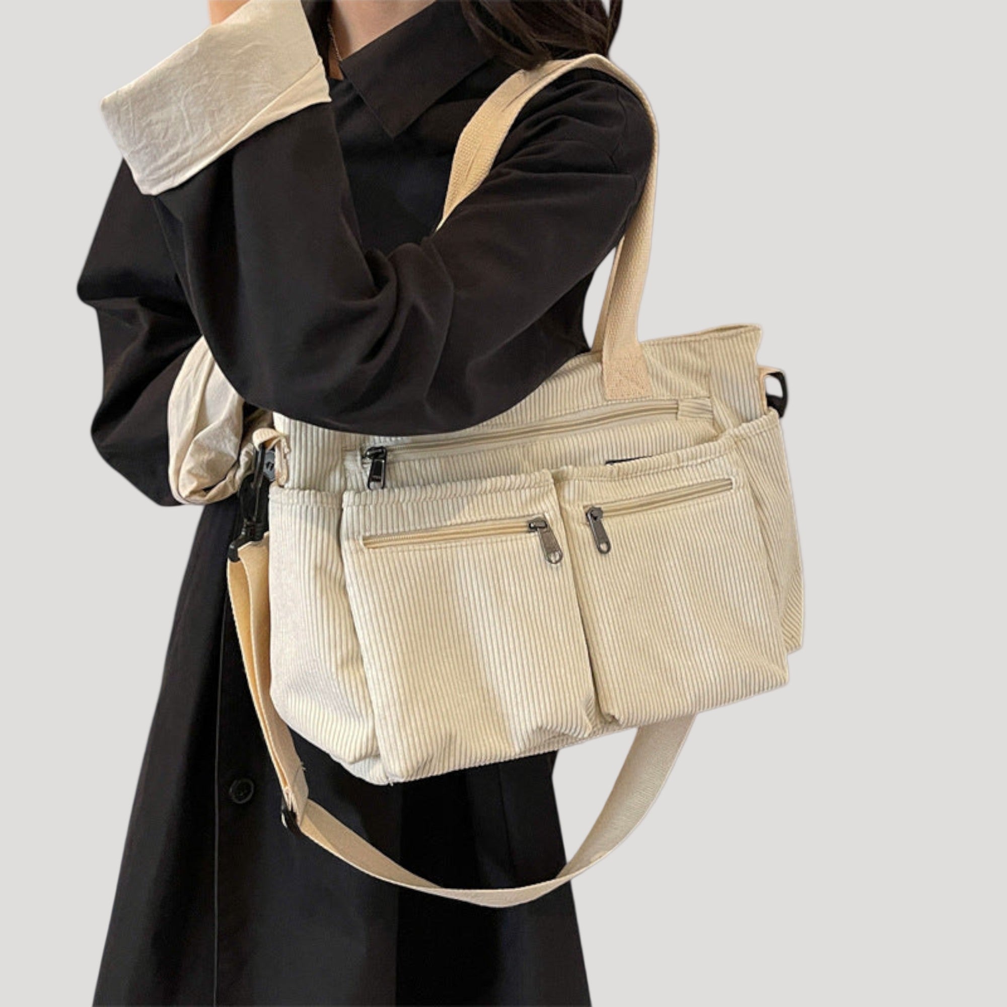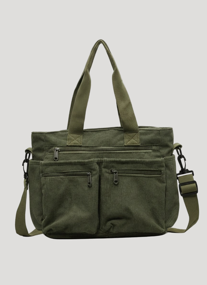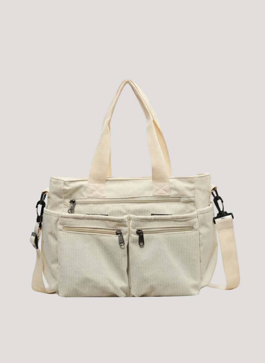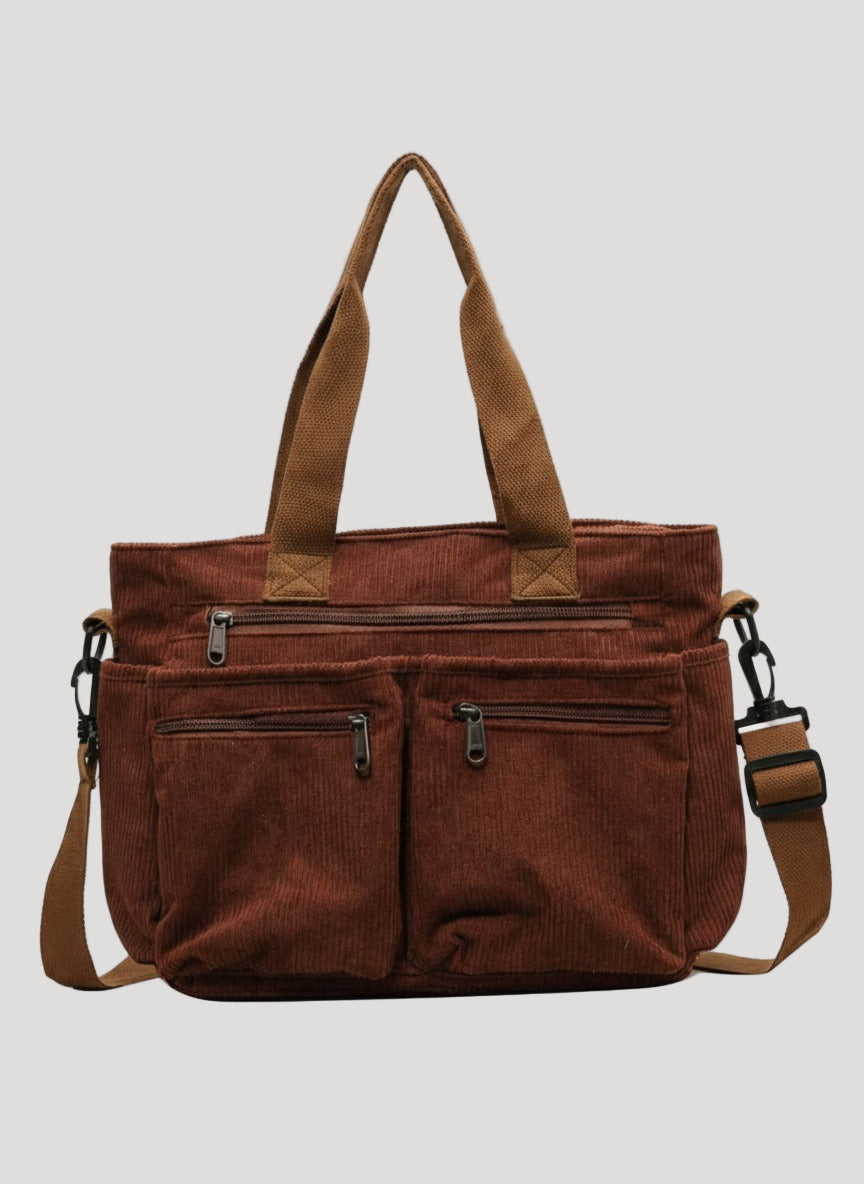 This women’s shoulder bag features a structured outer shape with top handles and an adjustable shoulder strap. The bag includes a main compartment with zipper closure and an inner pocket for smaller items. External zipper pockets are integrated into the front section.