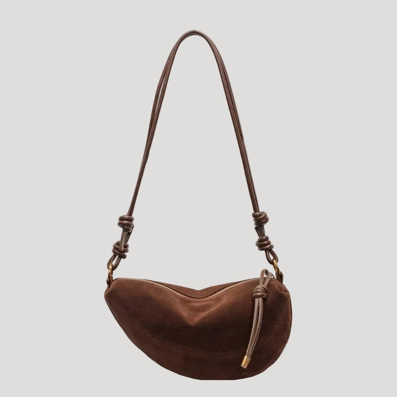 This women’s bag features a compact half-moon silhouette designed to sit comfortably against the body. The curved shape and slim profile make it suitable for everyday wear and city use. Decorative knots along the strap add visual structure, while the bag’s size allows for carrying essential items without excess volume.