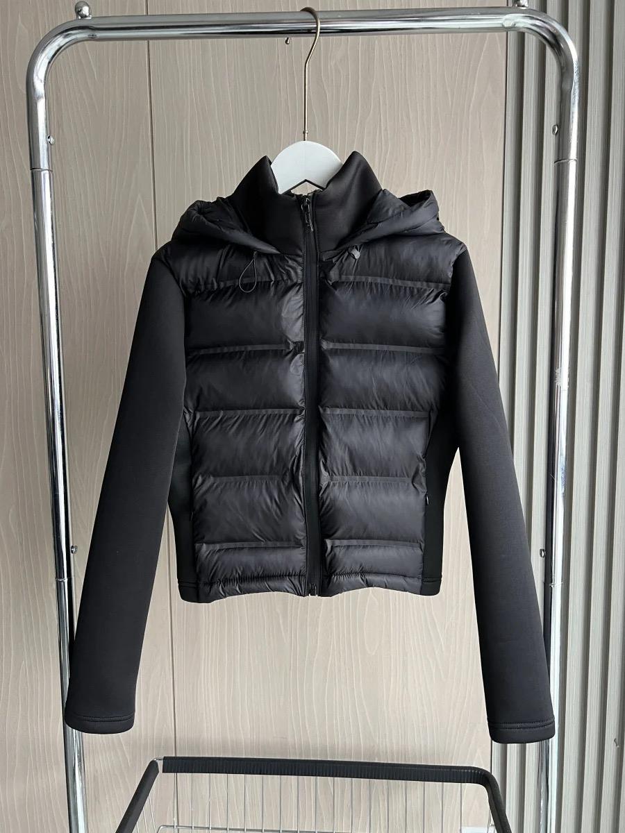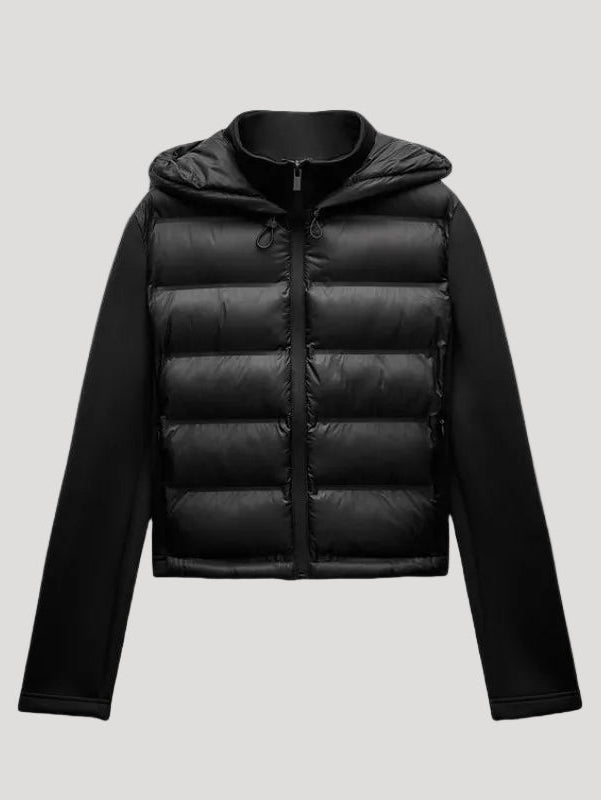 This jacket features a quilted front panel and smooth long sleeves. It includes a zip-up closure, an insulated hood, and horizontal quilt lines that create a structured surface. The hybrid construction combines a padded front with flexible side panels and sleeves. Suitable for everyday outdoor use.