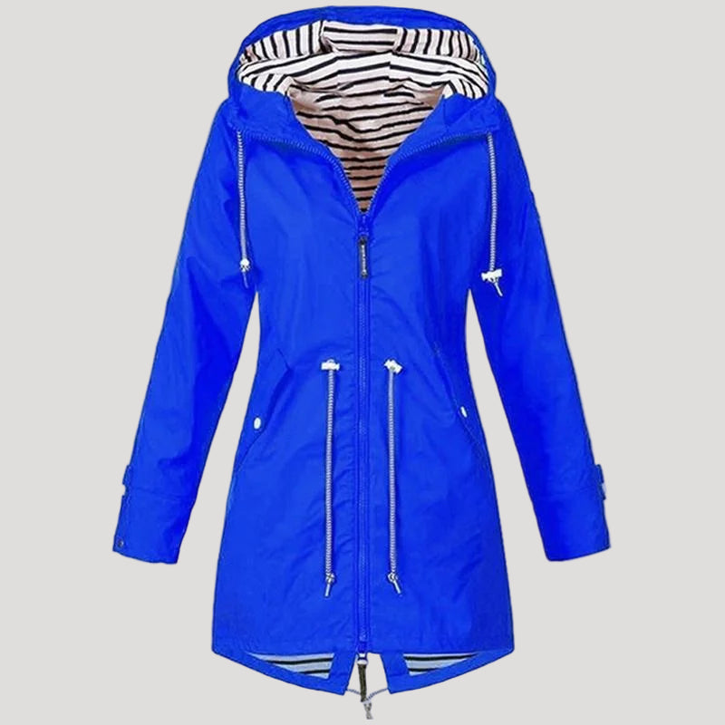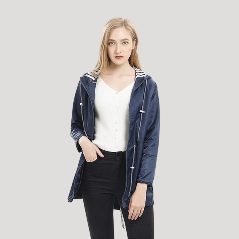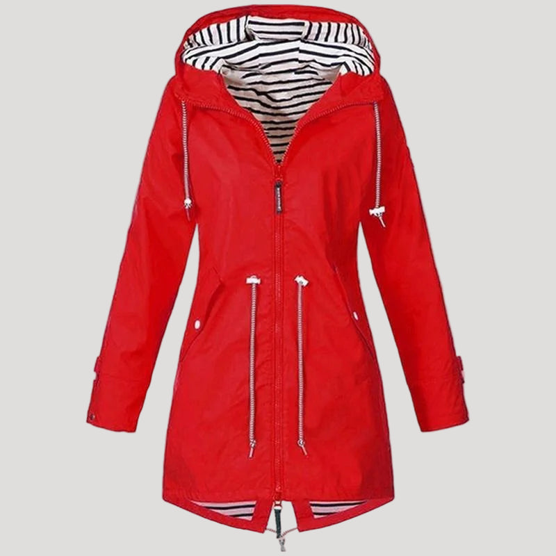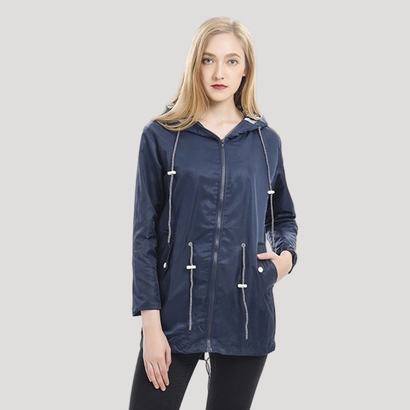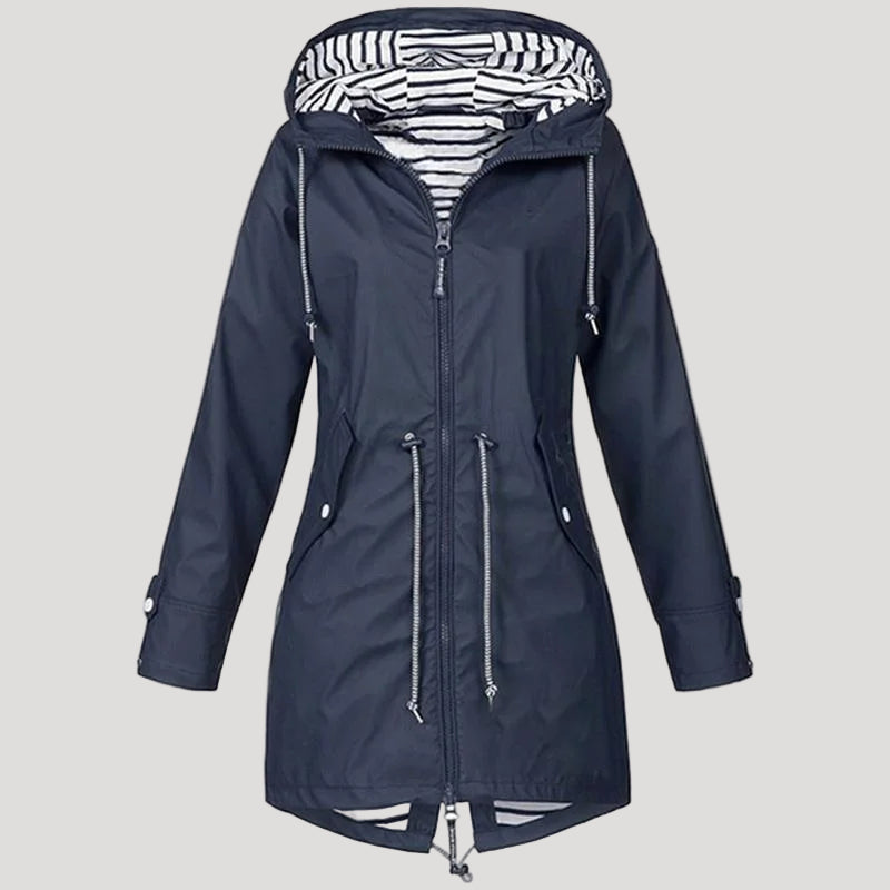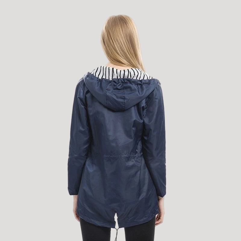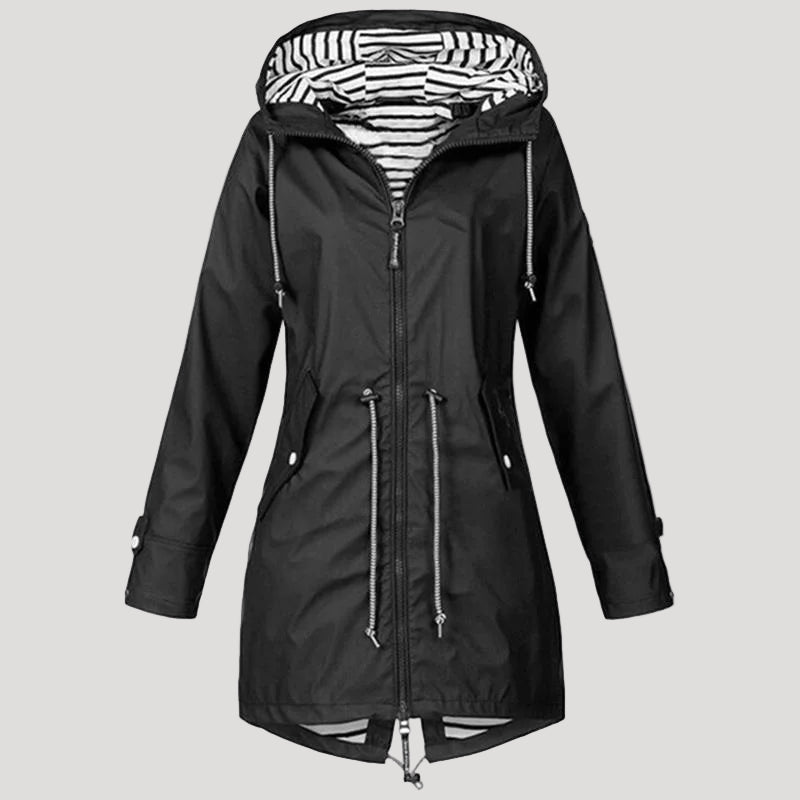 This lightweight waterproof jacket is designed for everyday protection, comfort, and effortless style. Made from durable, water-repellent fabric with a breathable striped lining, it shields you from rain and wind without feeling heavy. The adjustable waist drawcord creates a flattering silhouette, while the spacious hood and practical pockets make it perfect for commuting, travel, hiking, and casual outdoor wear. A functional essential that blends simplicity, comfort, and all-weather versatility.
