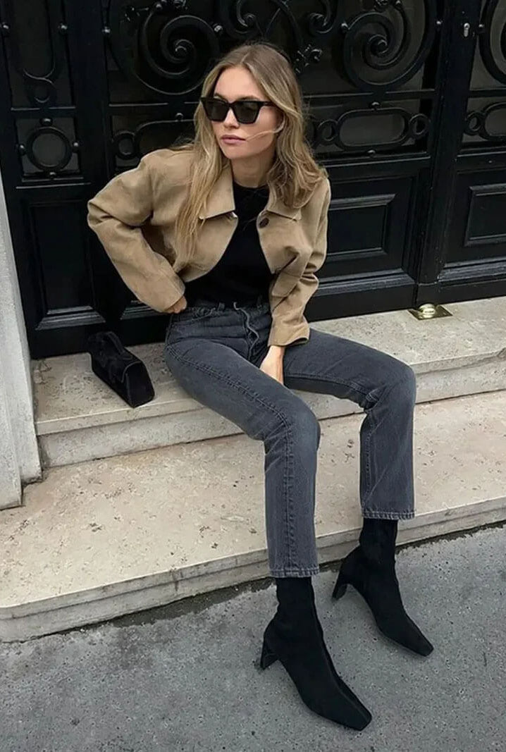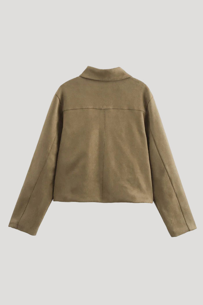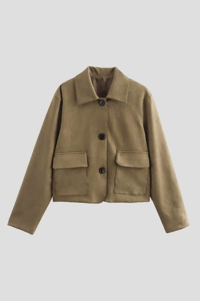 This cropped jacket features an oversized silhouette and a smooth woven outer material. The structured cut provides comfortable layering, while the classic collar and button-front closure create a clean and minimal appearance. The jacket includes functional front pockets and simple seam detailing for practical everyday use.