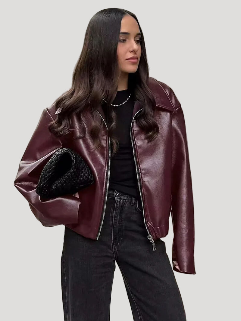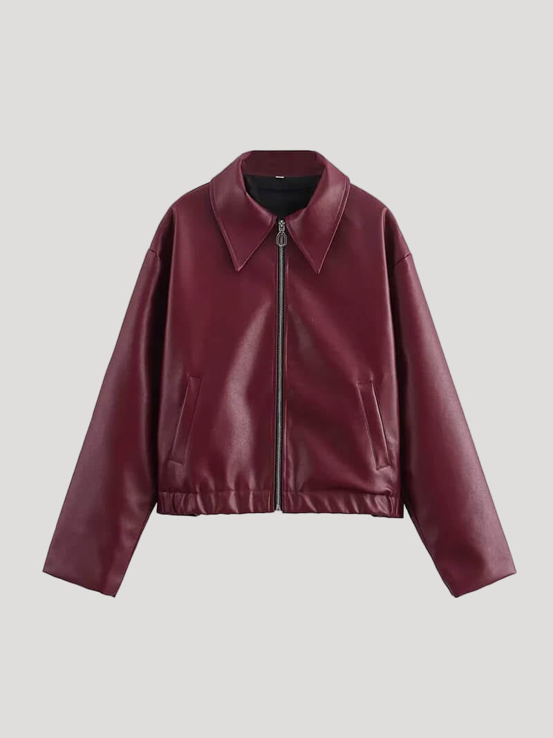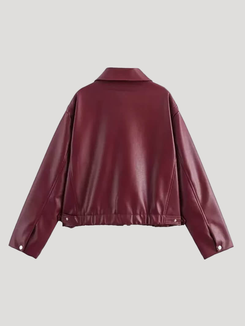This jacket features a wide lapel collar and a relaxed oversized silhouette. The smooth, structured surface gives it a modern biker-inspired look, while the soft inner feel ensures comfort throughout the day. The front zip closure adds a practical touch, making this jacket suitable for everyday outfits and transitional weather.