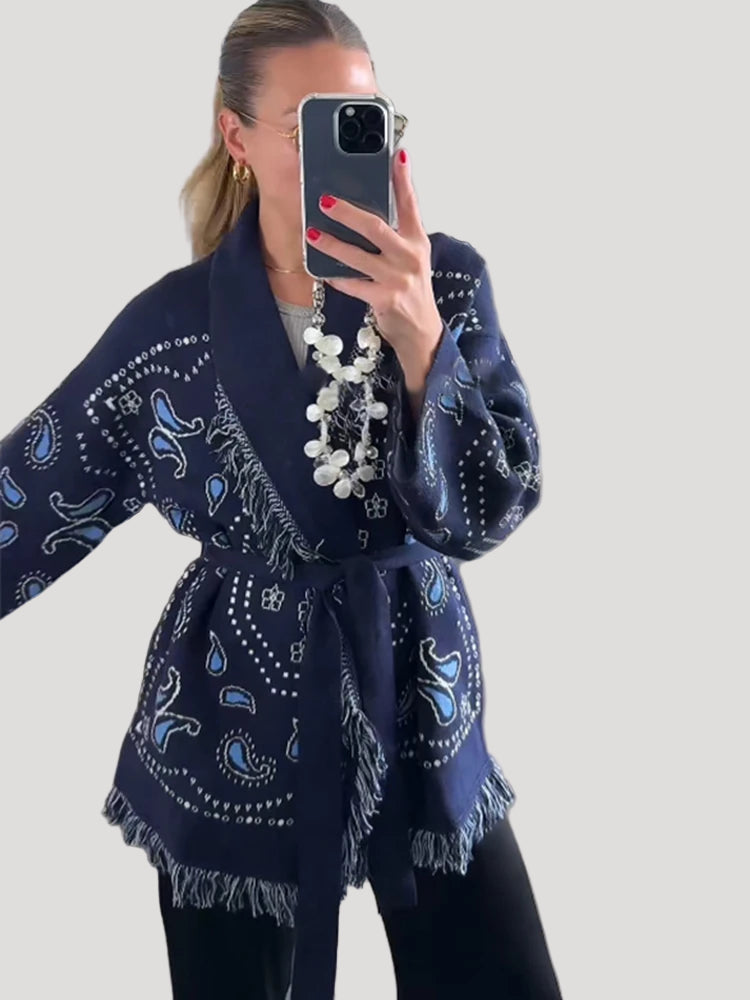 This cardigan features a relaxed silhouette, a shawl-style lapel, and a soft knitted finish. The statement paisley pattern adds a bold touch, while the matching belt allows you to cinch the waist for a more defined shape. Fringe detailing along the hem creates a stylish, modern look suitable for everyday outfits and elevated streetwear.