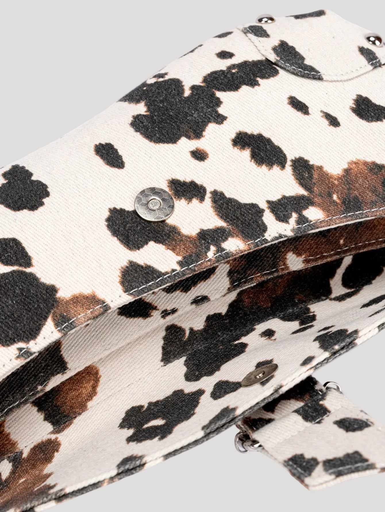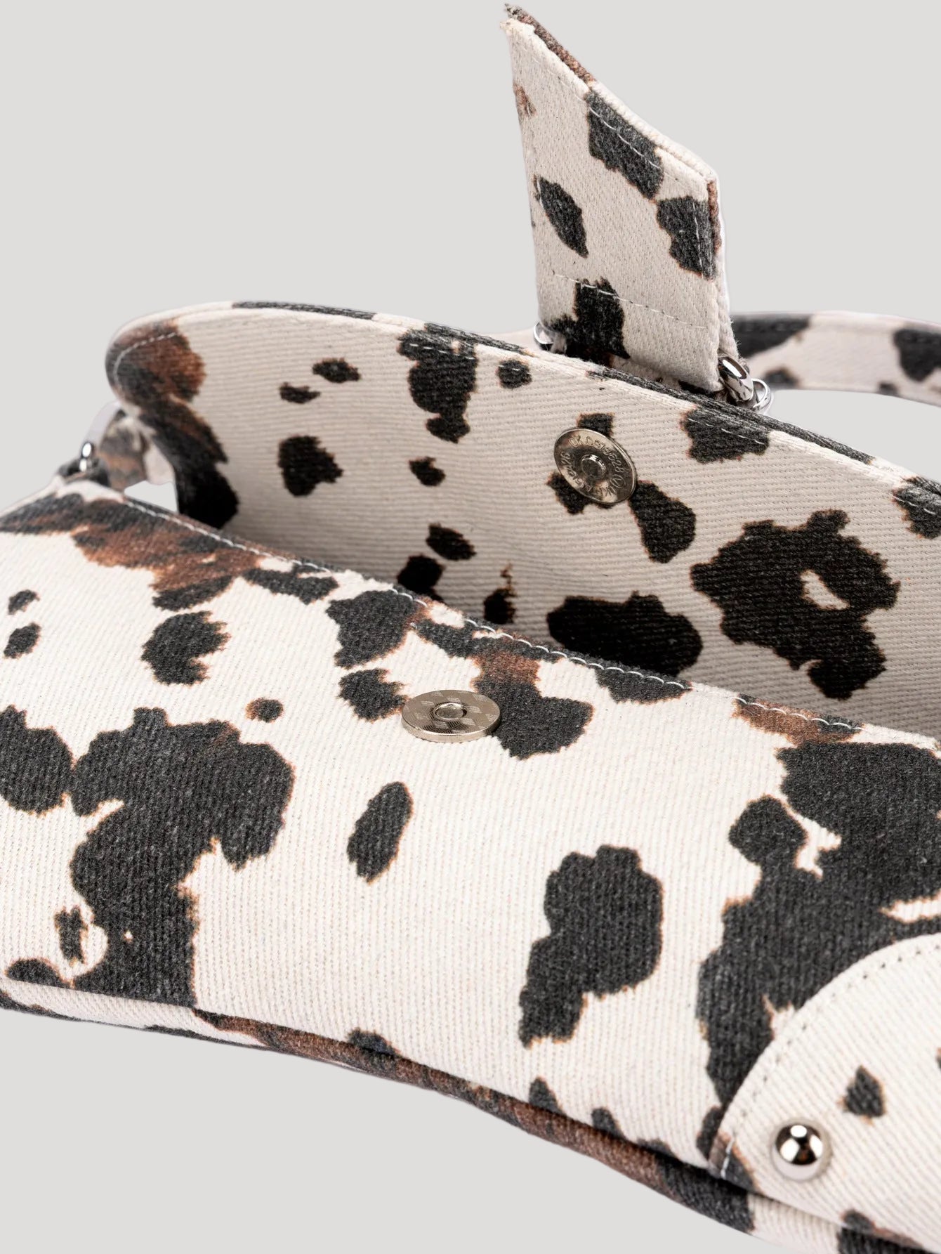 - Design: Structured silhouette with printed exterior and stud detailing