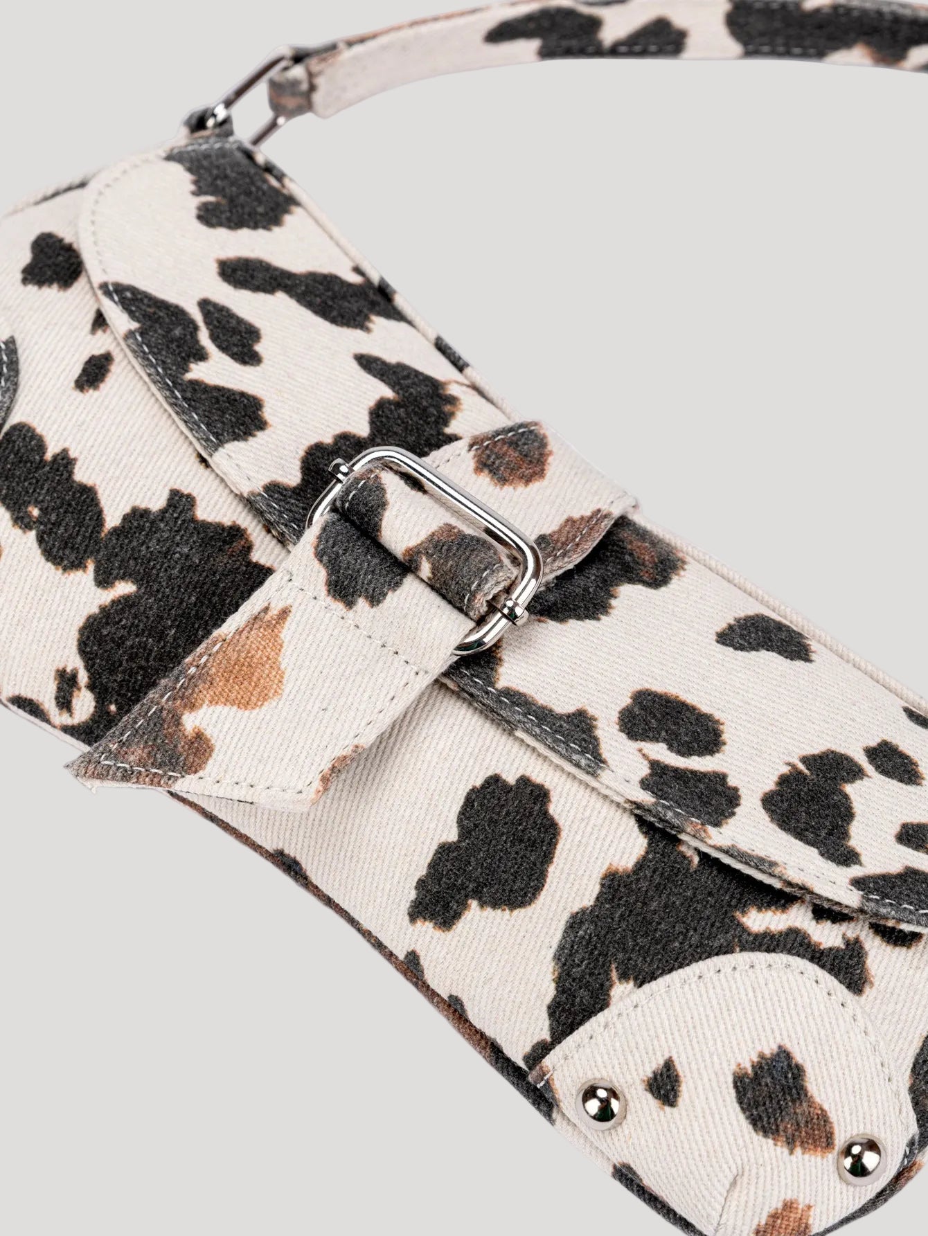 This women’s shoulder bag features a structured silhouette with a printed exterior surface and decorative stud detailing along the edges. The design includes a fixed buckle strap overlay with a magnetic closure underneath. The interior consists of a single main compartment with one internal pocket, and the shoulder strap is adjustable using a buckle.