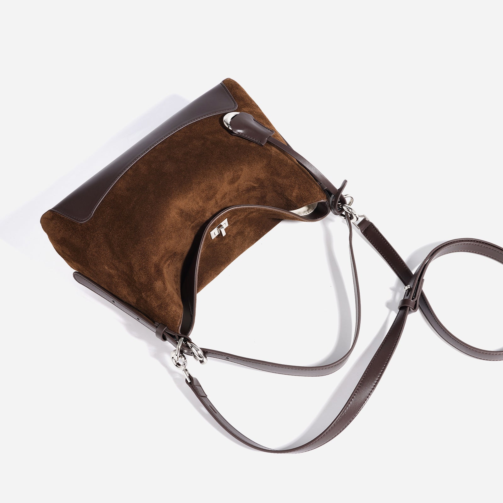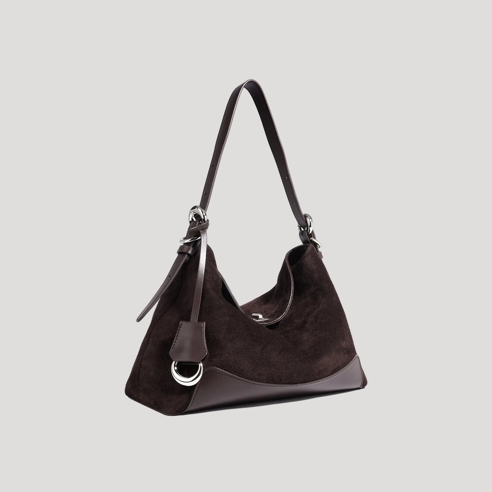 - Hardware: Metal rings and fittings in silver tone