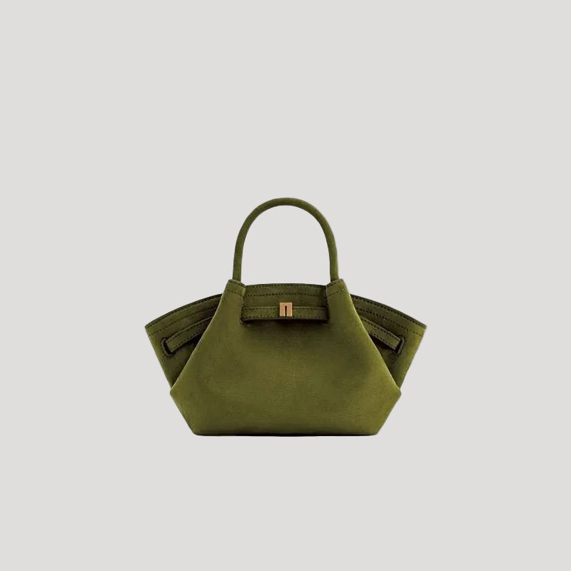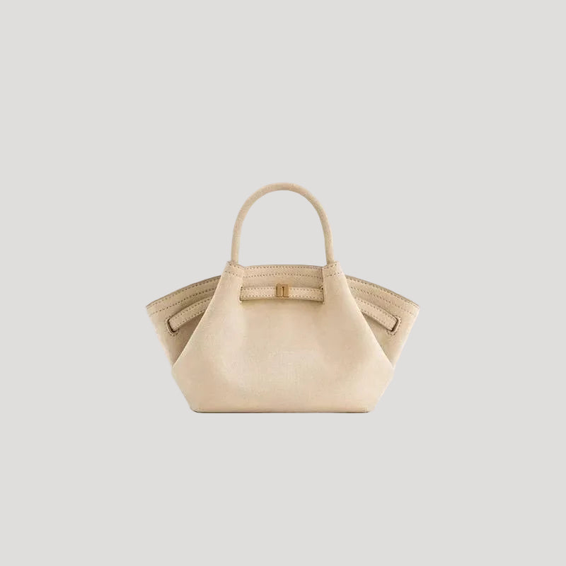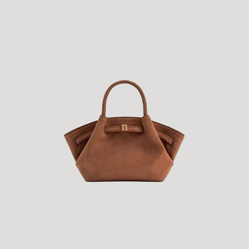 This women’s top-handle shoulder bag features a compact, structured silhouette with folded side panels and a defined base. The bag includes two fixed top handles and a structured body that maintains its shape when placed down.