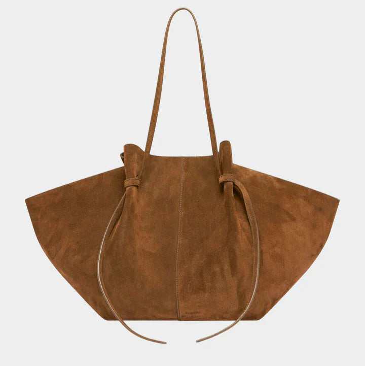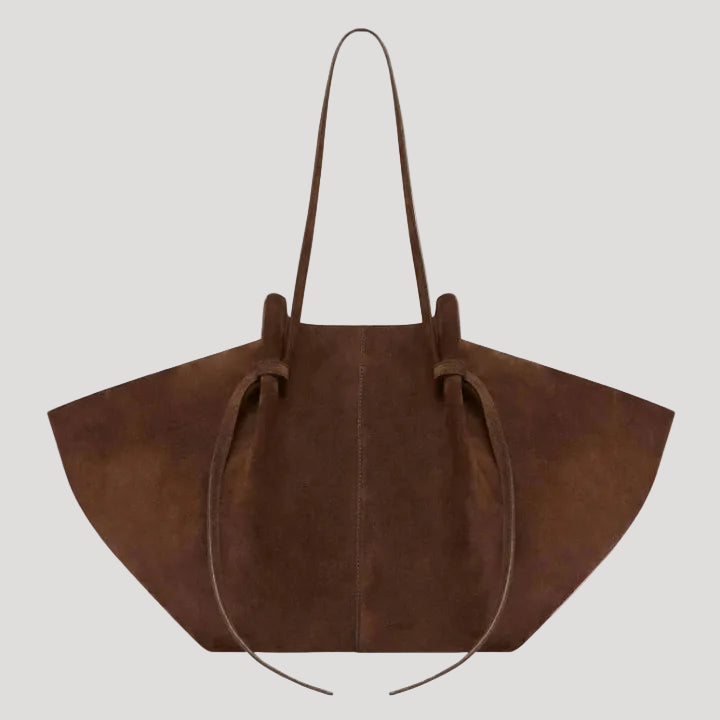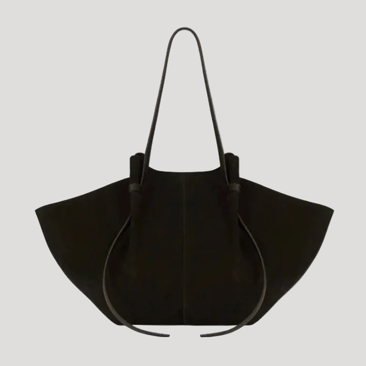 This women’s tote bag features a wide, structured silhouette with extended side panels and a softly contoured shape. The design includes long carry straps and a stable base, allowing the bag to be worn over the shoulder or carried by hand. Its large interior layout is suitable for everyday items and work-related use.