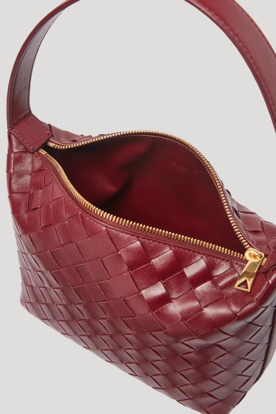 This women’s mini shoulder bag features a compact silhouette with a woven exterior surface. The design includes a top zip closure and a fixed shoulder strap. The interior consists of a single main compartment with a continuous structure.