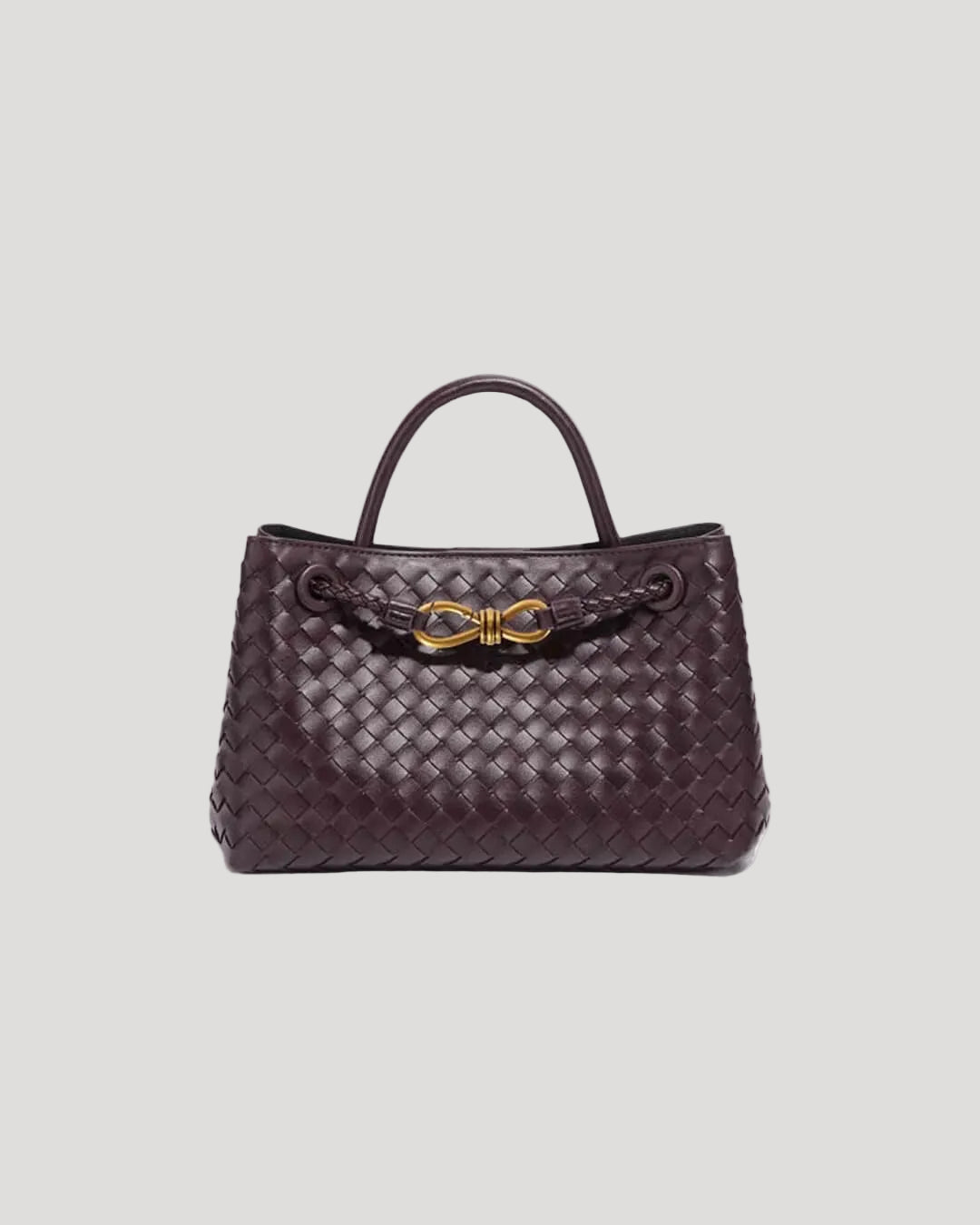 This women’s woven satchel bag features a structured silhouette with dual top handles and a top zip closure. The compact shape includes a defined body with softly rounded edges and a woven exterior finish. The bag can be carried by hand or worn using the adjustable shoulder strap.