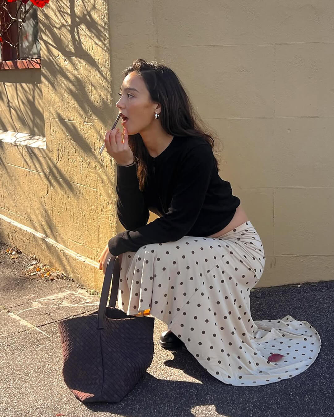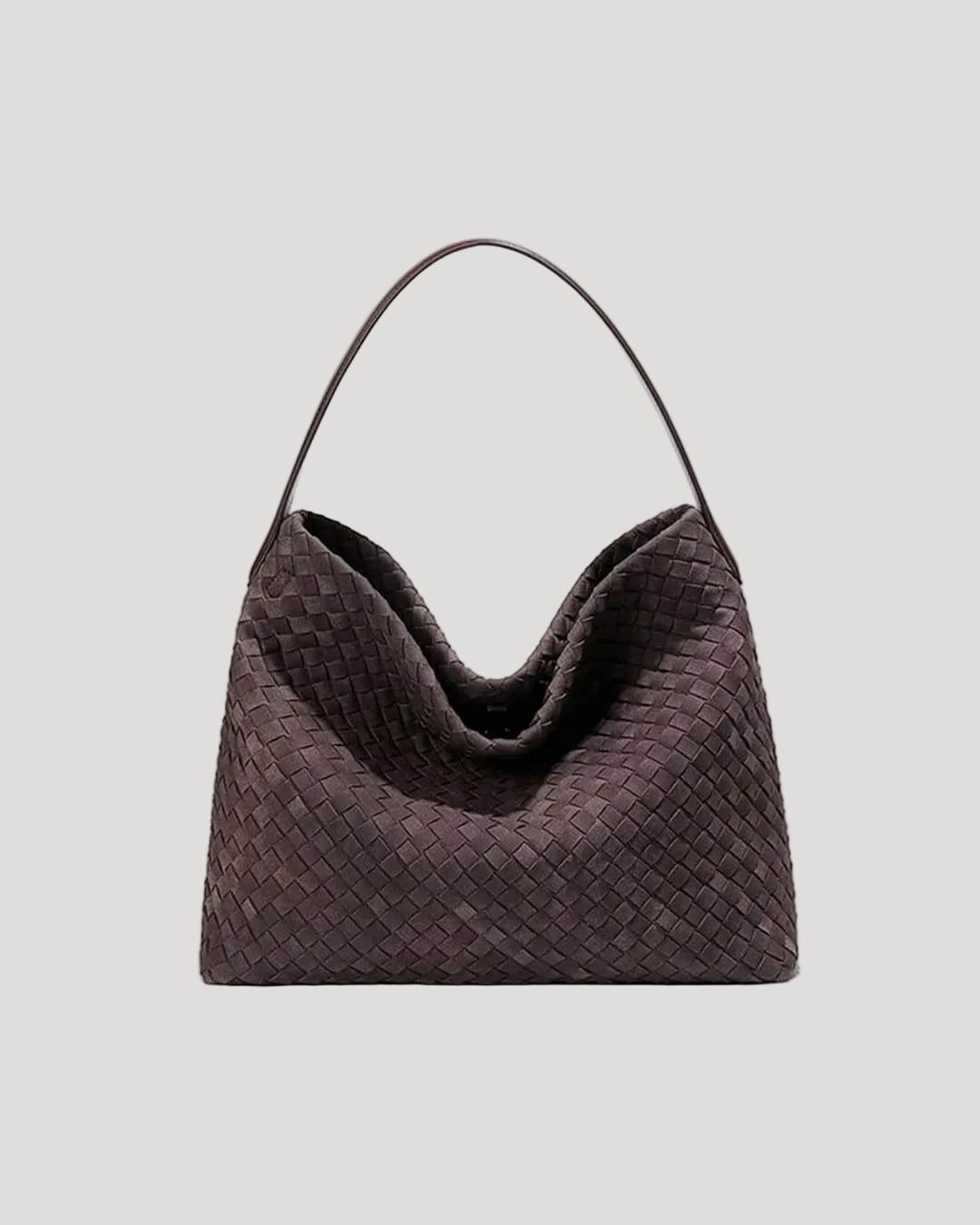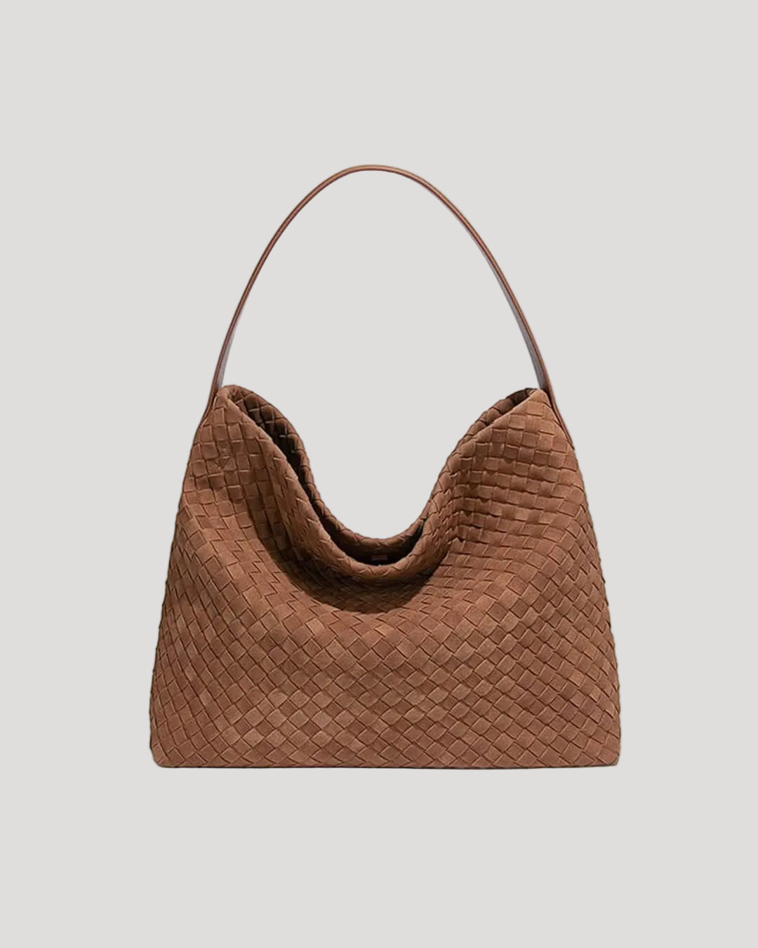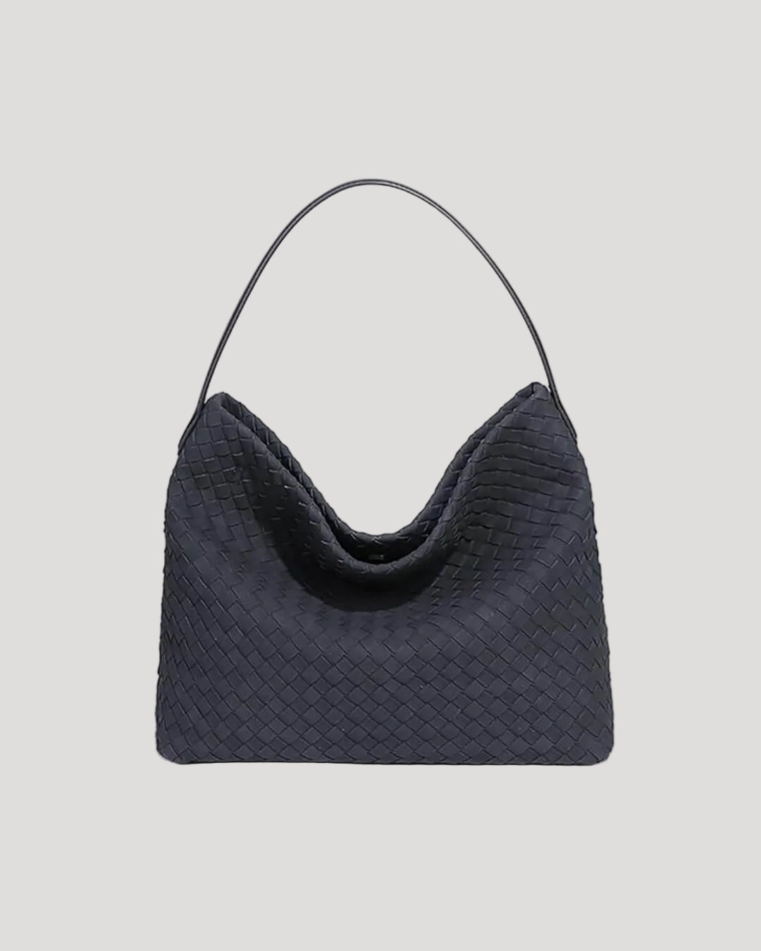 This women’s woven shoulder tote bag features a soft, flexible silhouette with a woven exterior surface. The bag is designed with a single long shoulder strap and an open, slouch-style form.