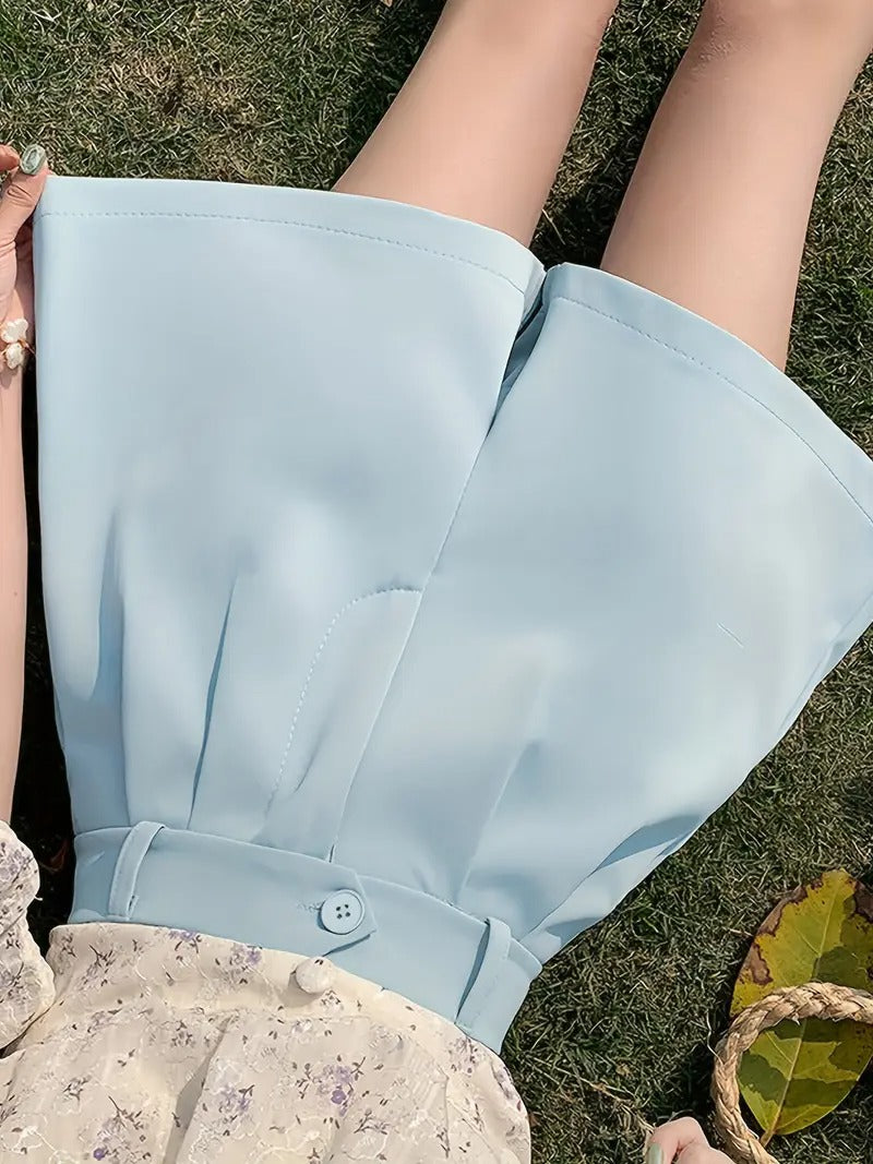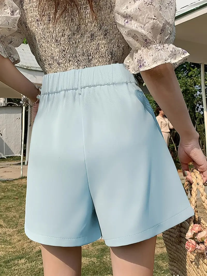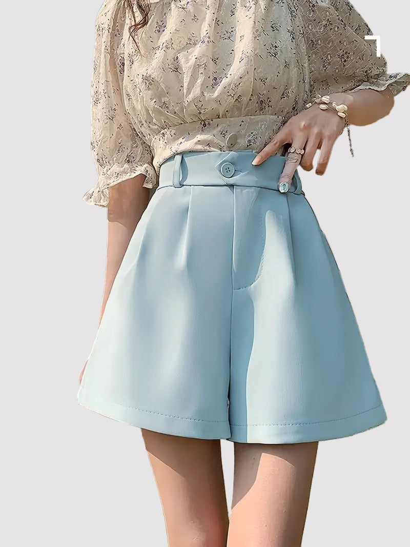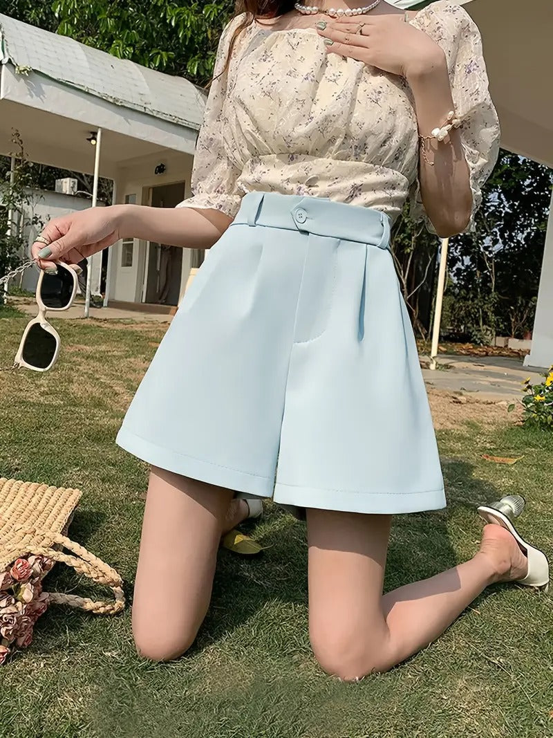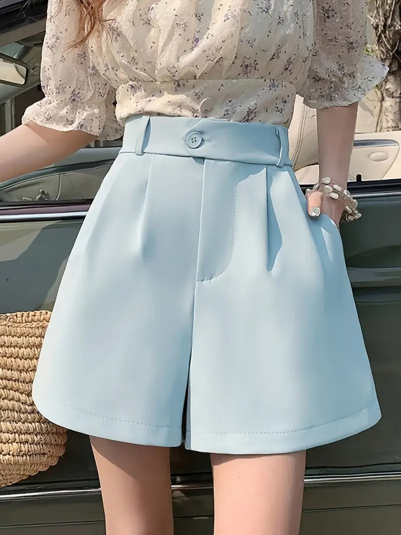 These women's shorts are high-waisted with a wide leg fit. The waistband features a single button closure along with belt loops. The shorts include side pockets for storage. With a mid-thigh length, the hemline falls just above the knee.