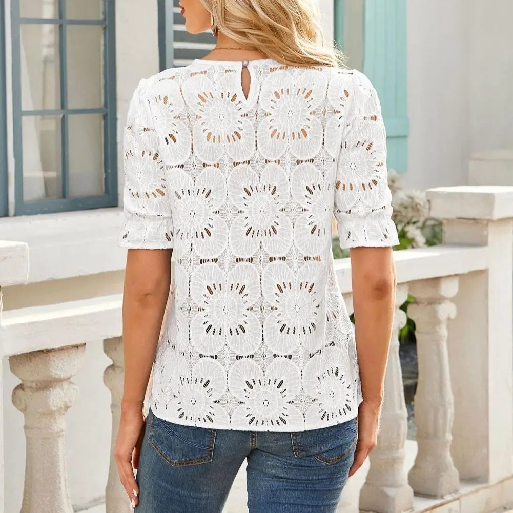 This women's blouse features short sleeves with a slight puff and subtle ruffled cuffs. The top has a crew neckline and an all-over eyelet pattern forming a floral motif. The back includes a keyhole opening at the nape.