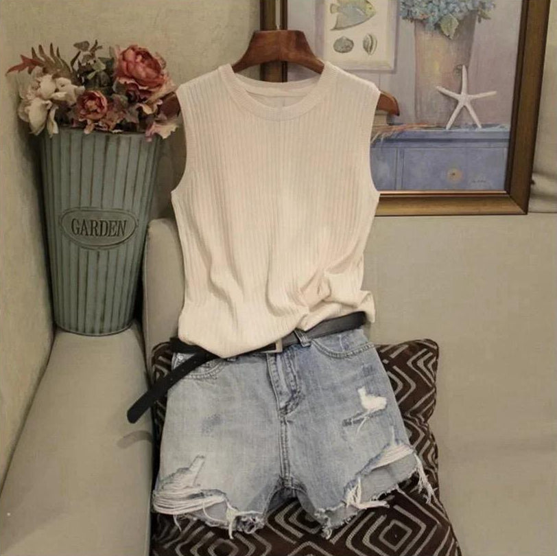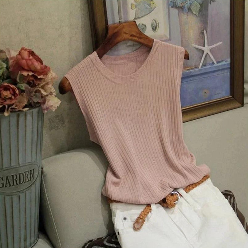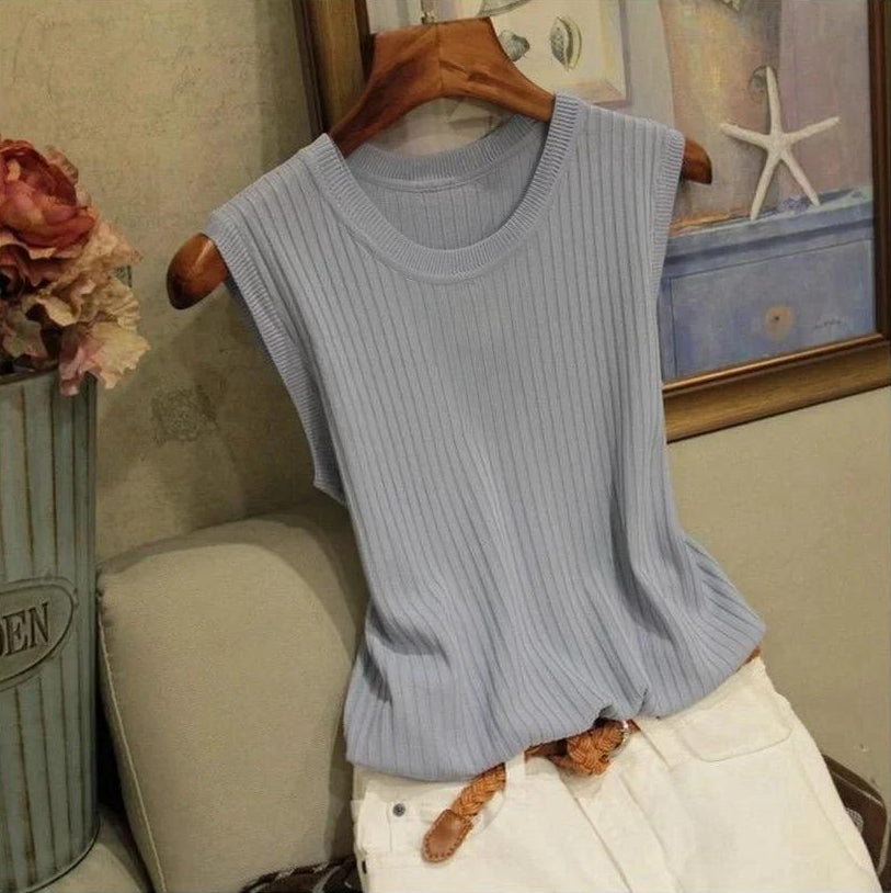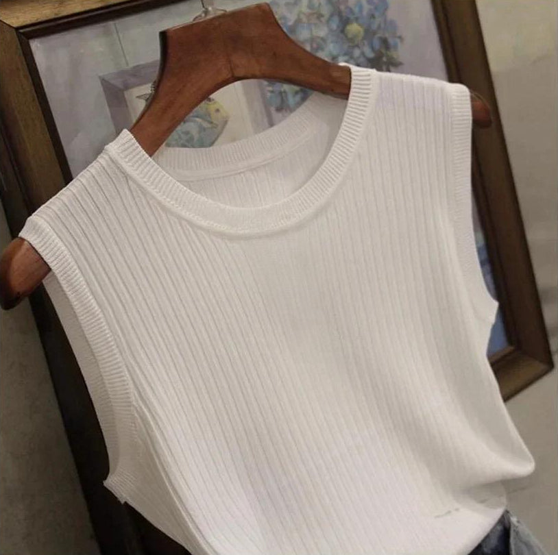 This sleeveless knitted top features a soft ribbed texture that creates a flattering, comfortable fit. Its O-neck design keeps the look clean and versatile, making it an easy piece to pair with jeans, skirts, or shorts. Lightweight and breathable, this top is perfect for everyday summer wear, layering, or creating effortlessly polished outfits.