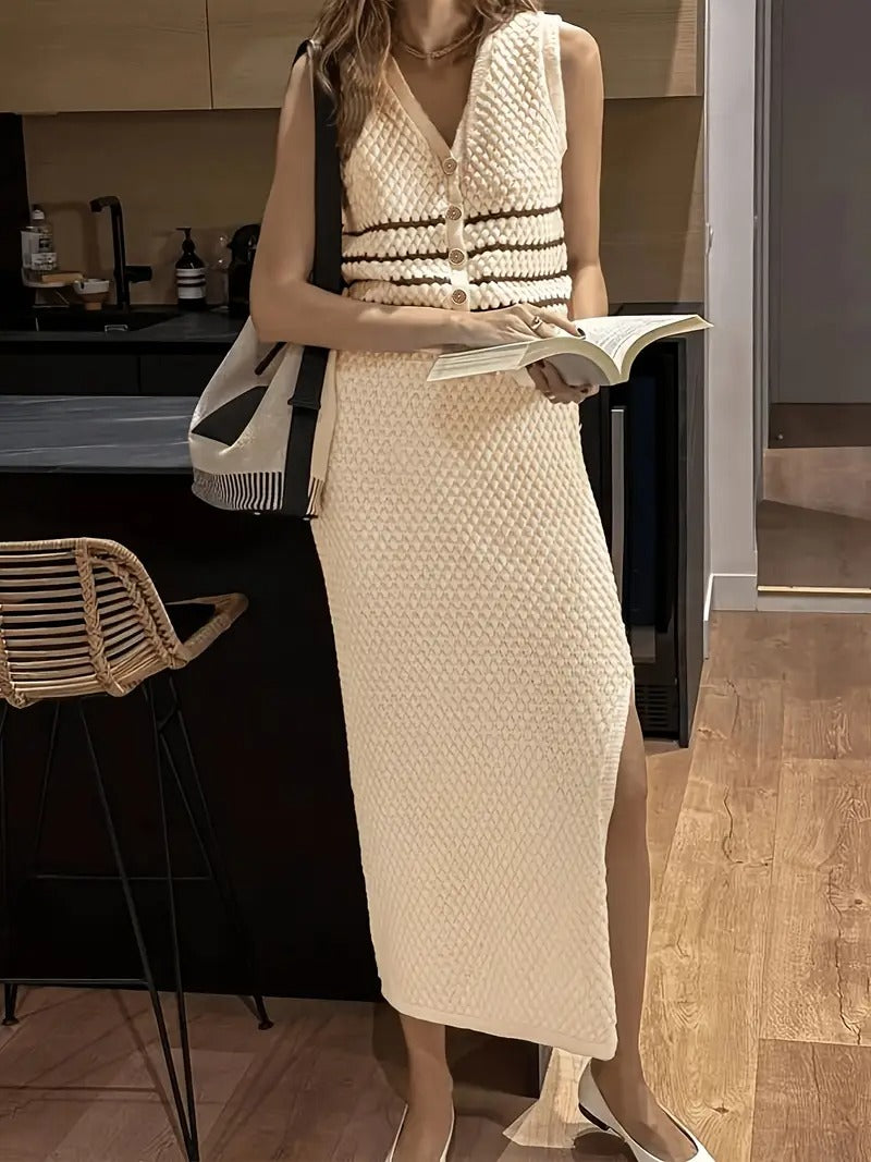 - Style: Coordinated two-piece set combining a buttoned vest top with a slit maxi skirt.