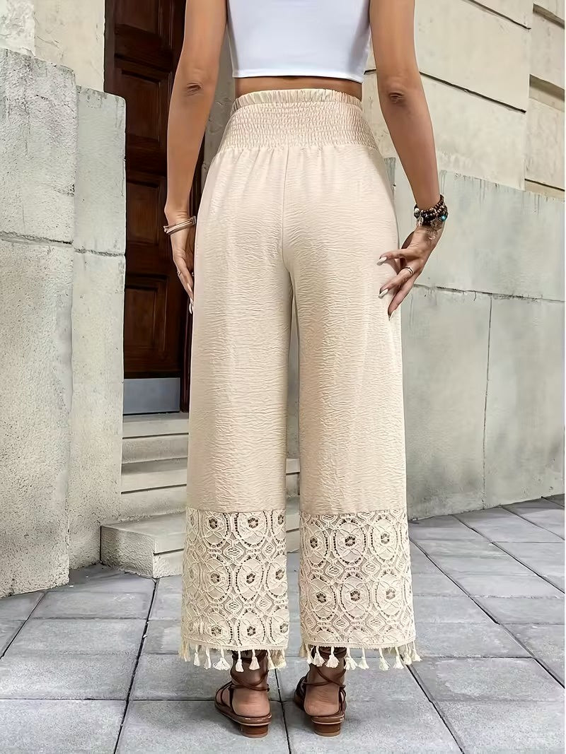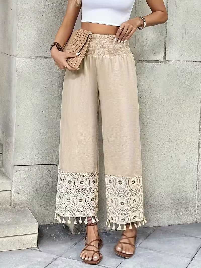 Key Features of this Smocked Waist Pants with Lace Panel and Tassels